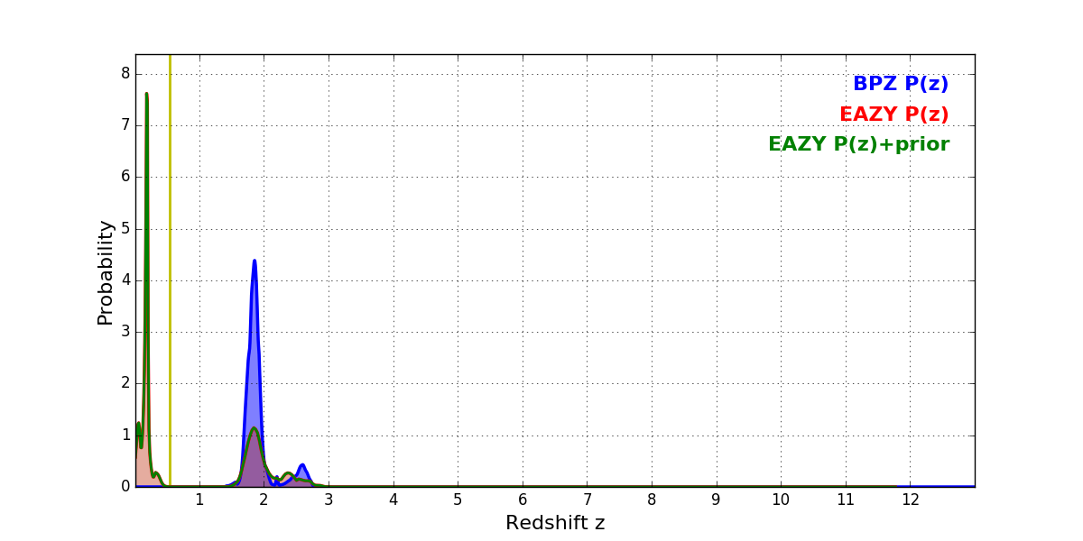 In P(z) plots: Yellow lines mark the cluster redshift z = 0.546,
