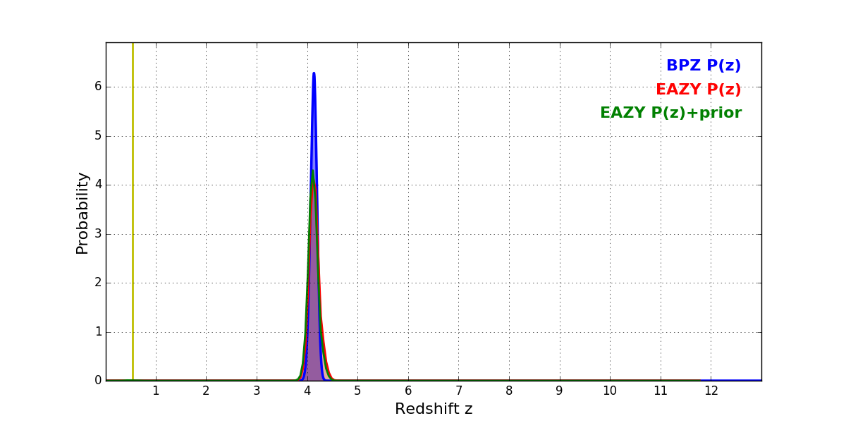 In P(z) plots: Yellow lines mark the cluster redshift z = 0.546,