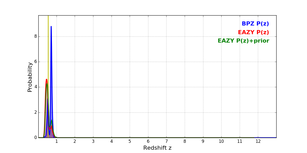 In P(z) plots: Yellow lines mark the cluster redshift z = 0.546,