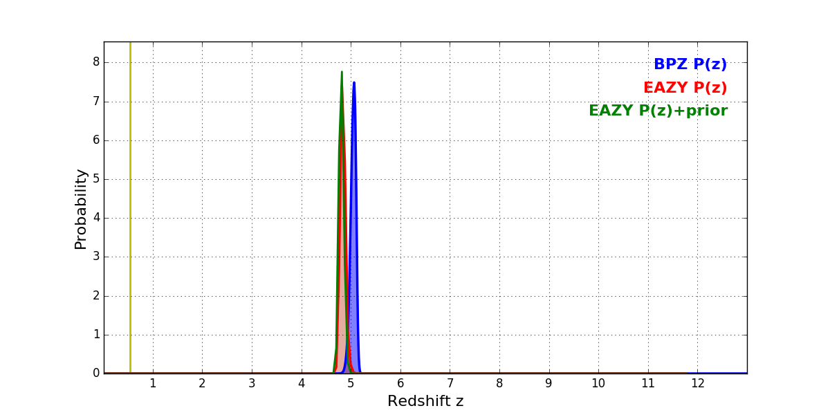 In P(z) plots: Yellow lines mark the cluster redshift z = 0.546,