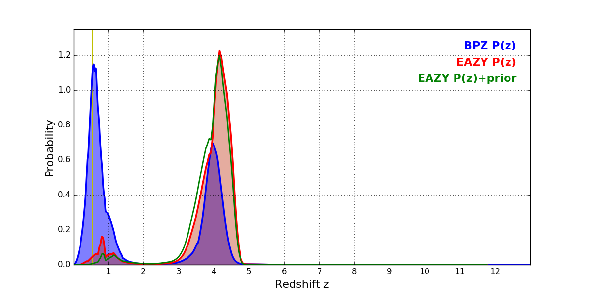 In P(z) plots: Yellow lines mark the cluster redshift z = 0.546,