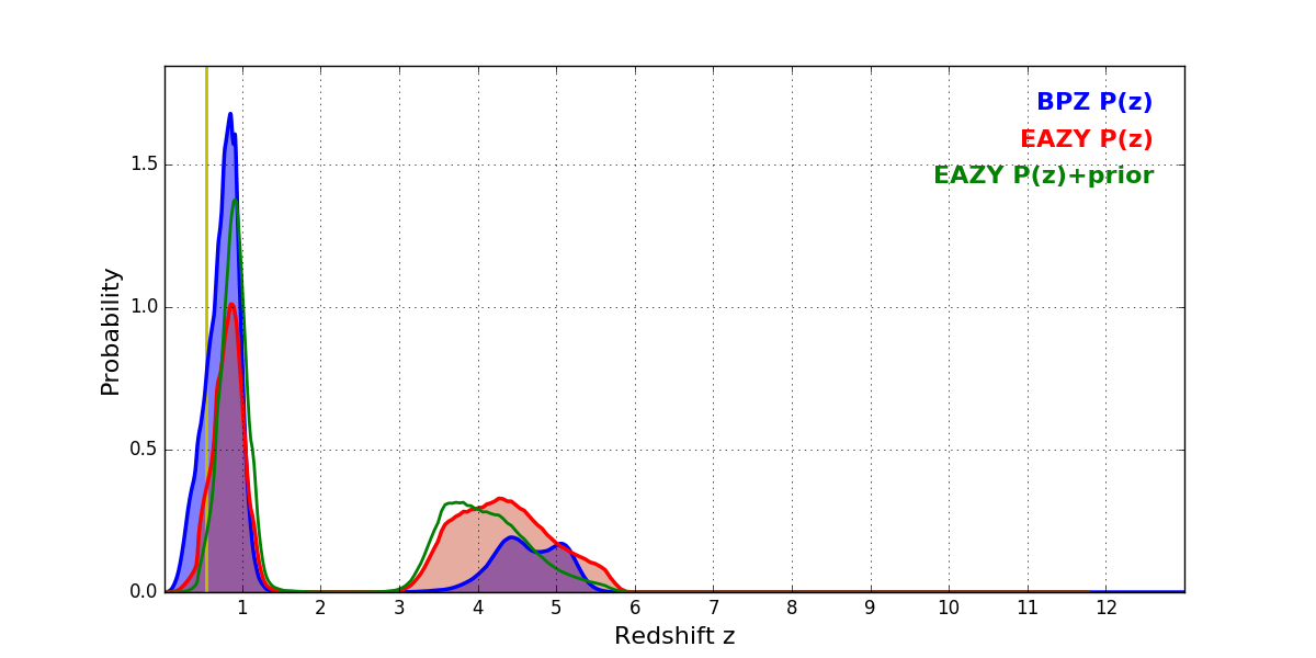 In P(z) plots: Yellow lines mark the cluster redshift z = 0.546,