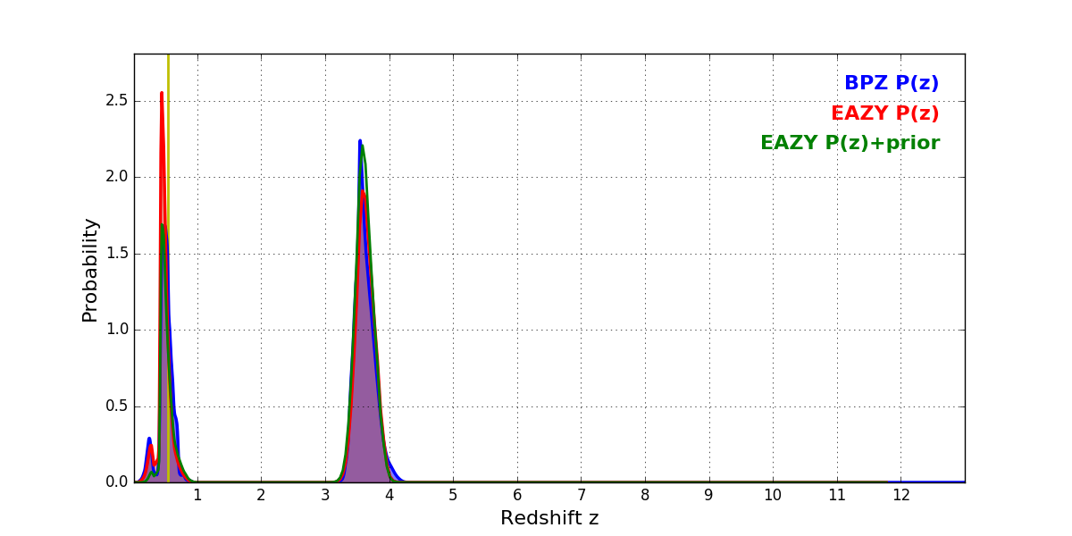 In P(z) plots: Yellow lines mark the cluster redshift z = 0.546,