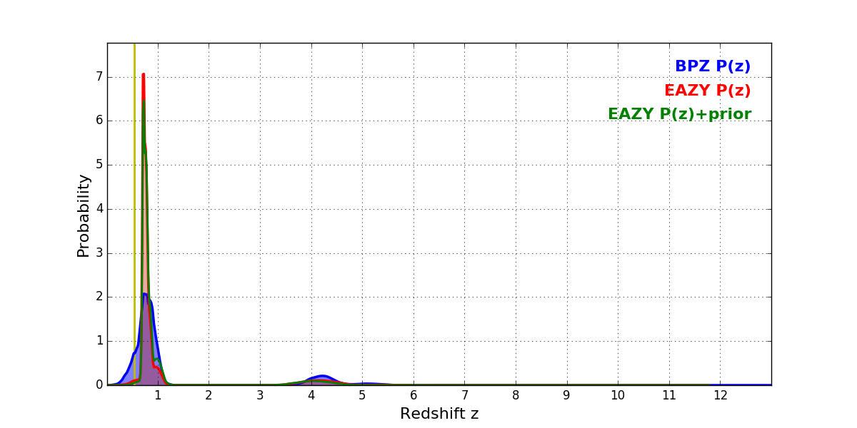 In P(z) plots: Yellow lines mark the cluster redshift z = 0.546,