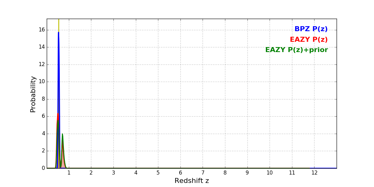 In P(z) plots: Yellow lines mark the cluster redshift z = 0.546,