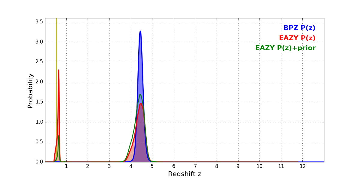 In P(z) plots: Yellow lines mark the cluster redshift z = 0.546,