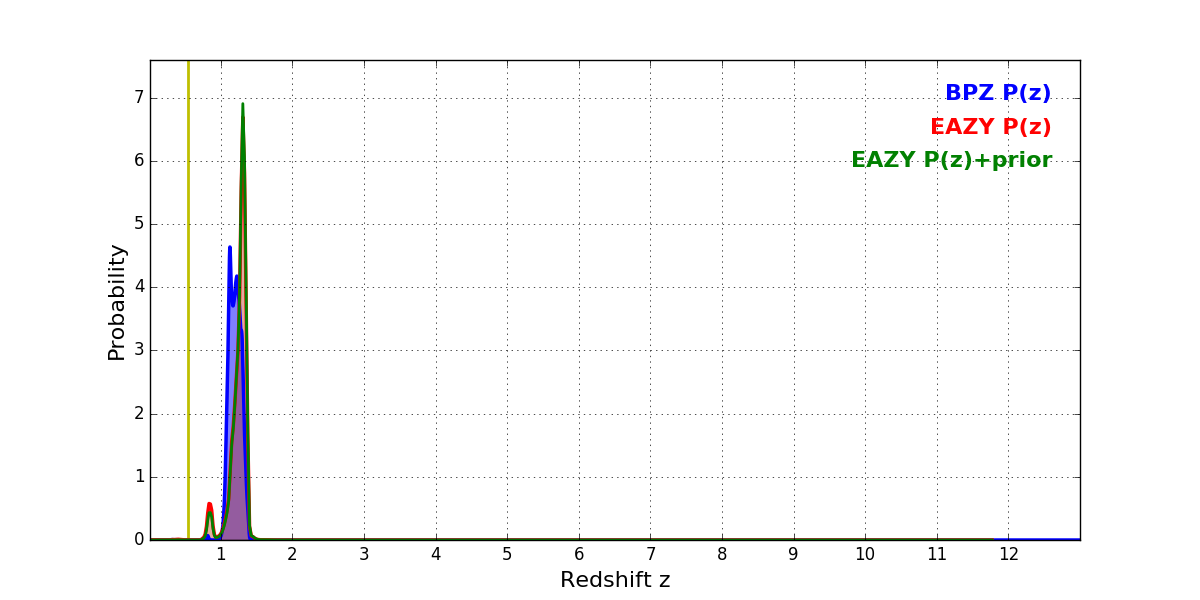 In P(z) plots: Yellow lines mark the cluster redshift z = 0.546,
