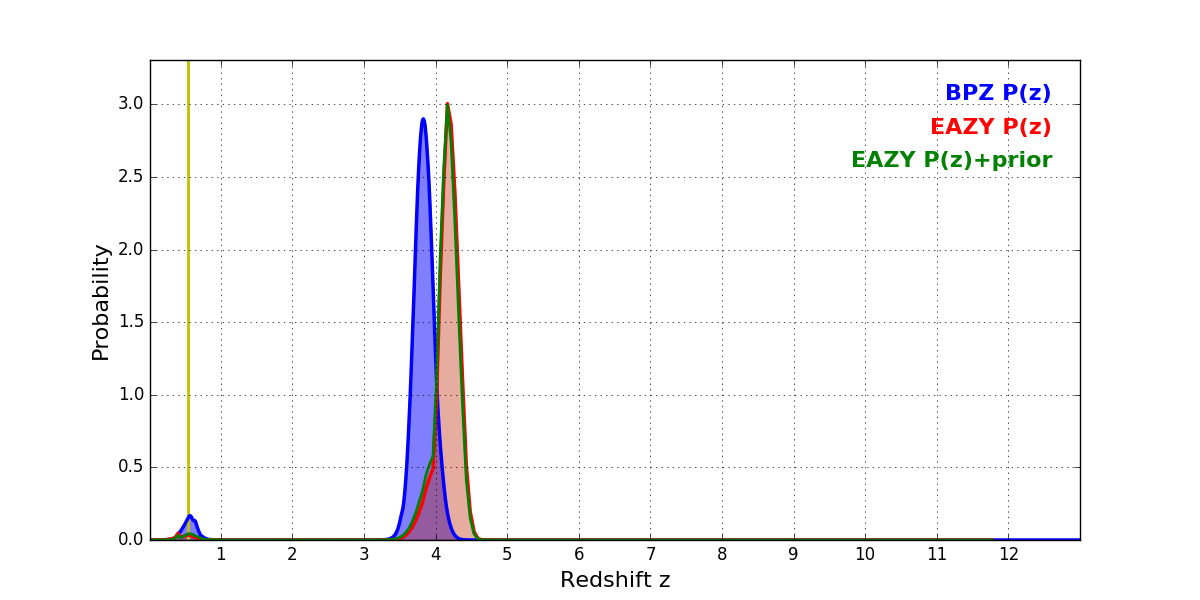 In P(z) plots: Yellow lines mark the cluster redshift z = 0.546,