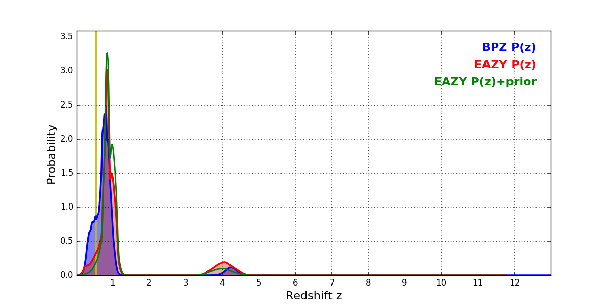 In P(z) plots: Yellow lines mark the cluster redshift z = 0.546,