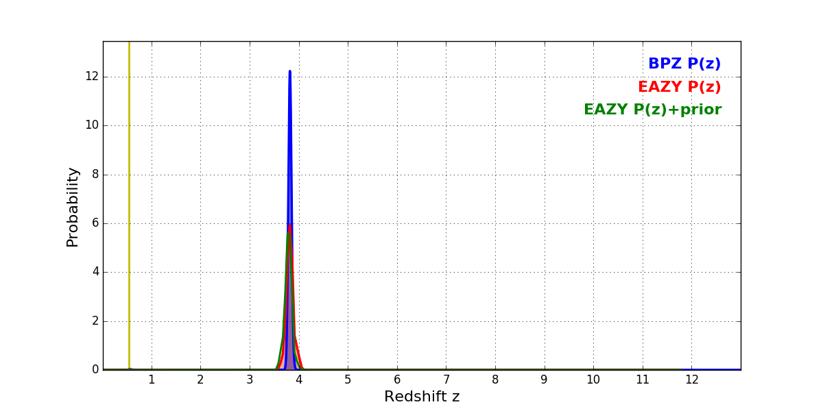 In P(z) plots: Yellow lines mark the cluster redshift z = 0.546,