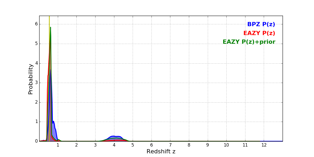 In P(z) plots: Yellow lines mark the cluster redshift z = 0.546,