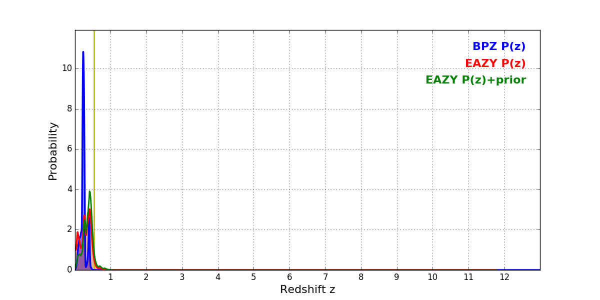 In P(z) plots: Yellow lines mark the cluster redshift z = 0.546,