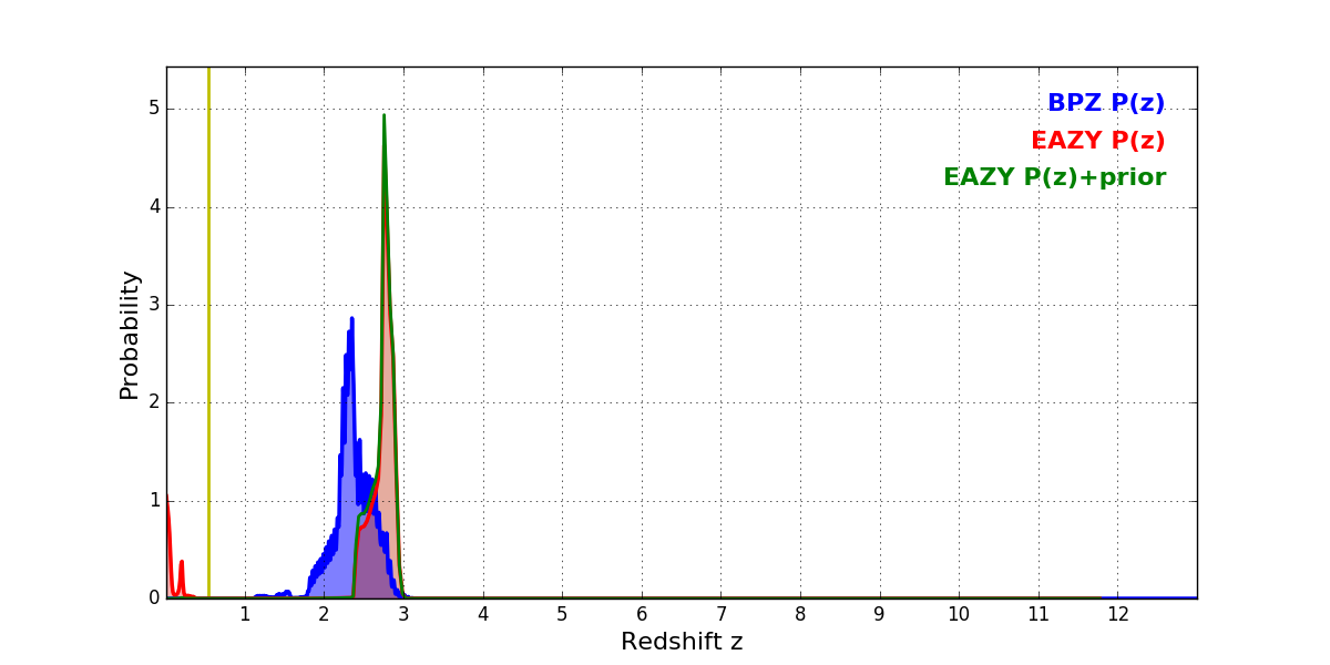 In P(z) plots: Yellow lines mark the cluster redshift z = 0.546,