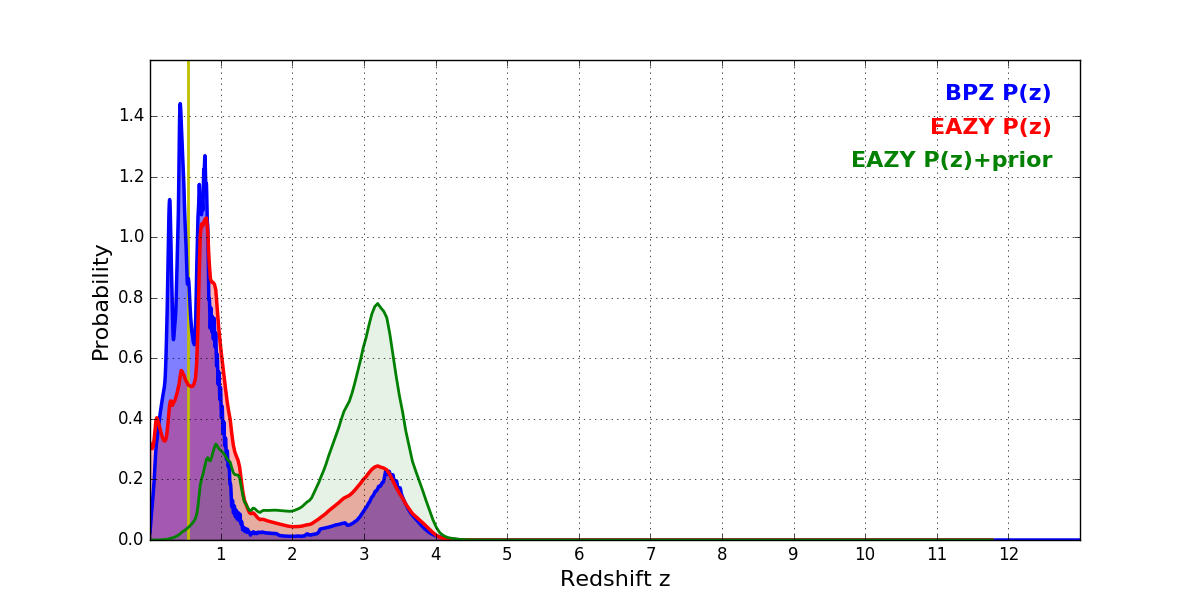 In P(z) plots: Yellow lines mark the cluster redshift z = 0.546,