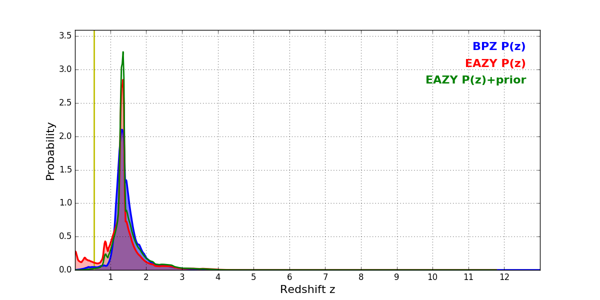 In P(z) plots: Yellow lines mark the cluster redshift z = 0.546,