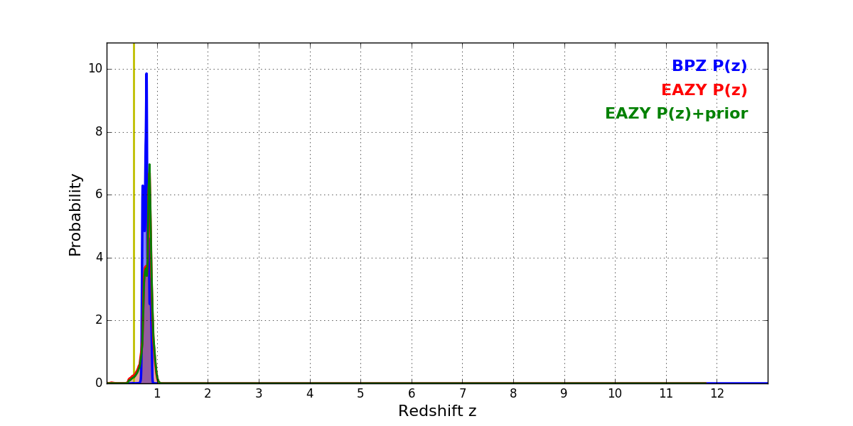 In P(z) plots: Yellow lines mark the cluster redshift z = 0.546,
