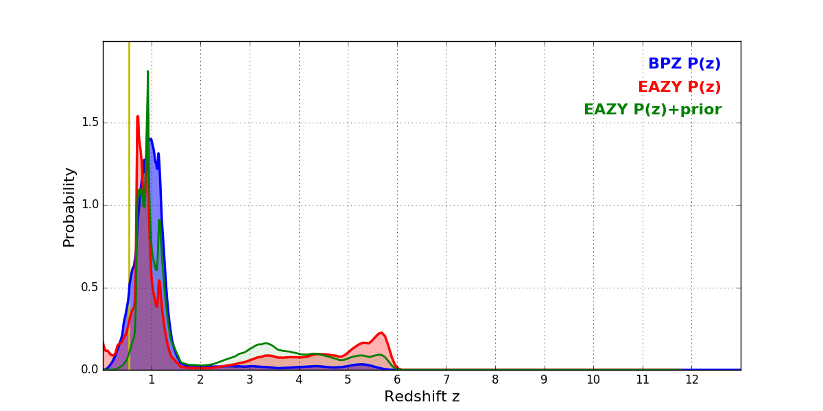 In P(z) plots: Yellow lines mark the cluster redshift z = 0.546,