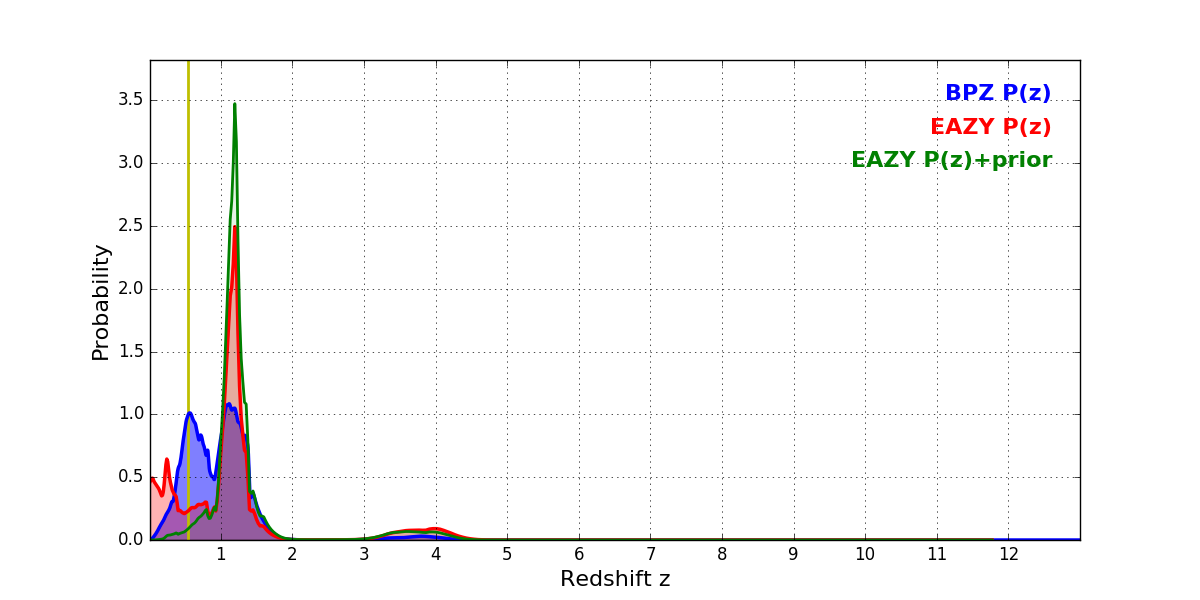 In P(z) plots: Yellow lines mark the cluster redshift z = 0.546,