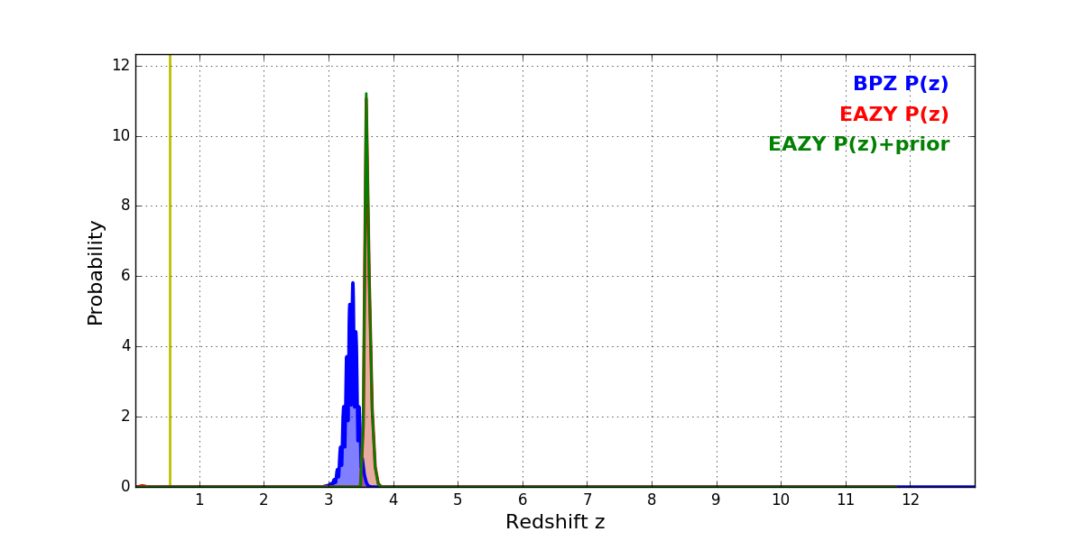 In P(z) plots: Yellow lines mark the cluster redshift z = 0.546,