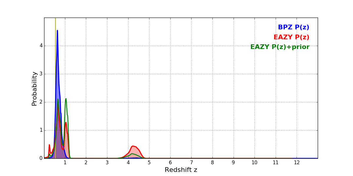 In P(z) plots: Yellow lines mark the cluster redshift z = 0.546,