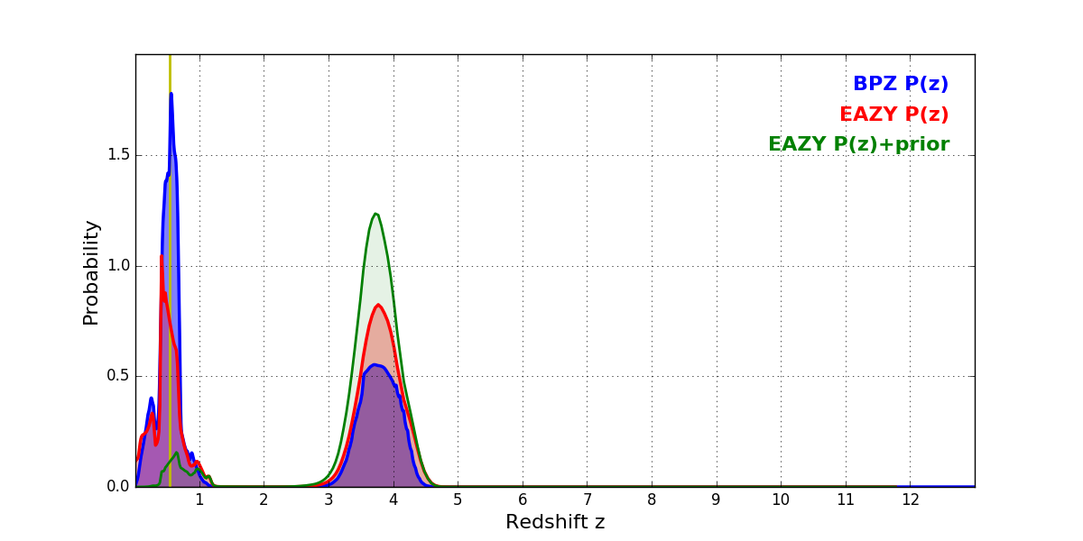 In P(z) plots: Yellow lines mark the cluster redshift z = 0.546,