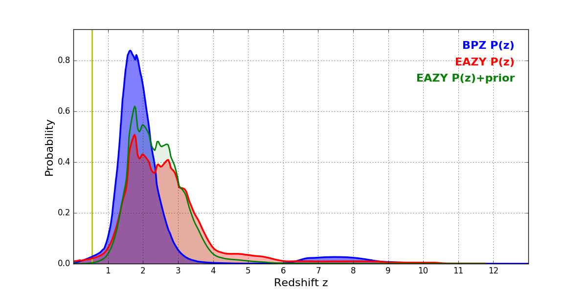 In P(z) plots: Yellow lines mark the cluster redshift z = 0.546,
