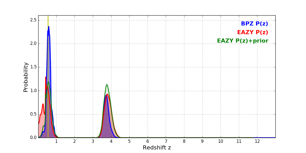 In P(z) plots: Yellow lines mark the cluster redshift z = 0.546,