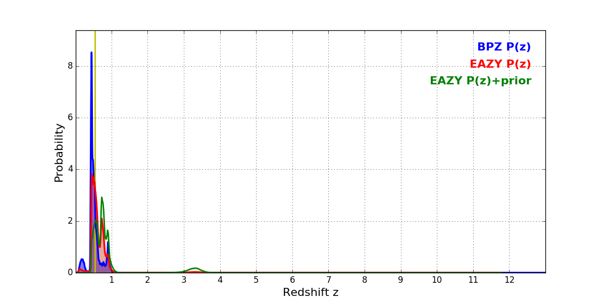 In P(z) plots: Yellow lines mark the cluster redshift z = 0.546,
