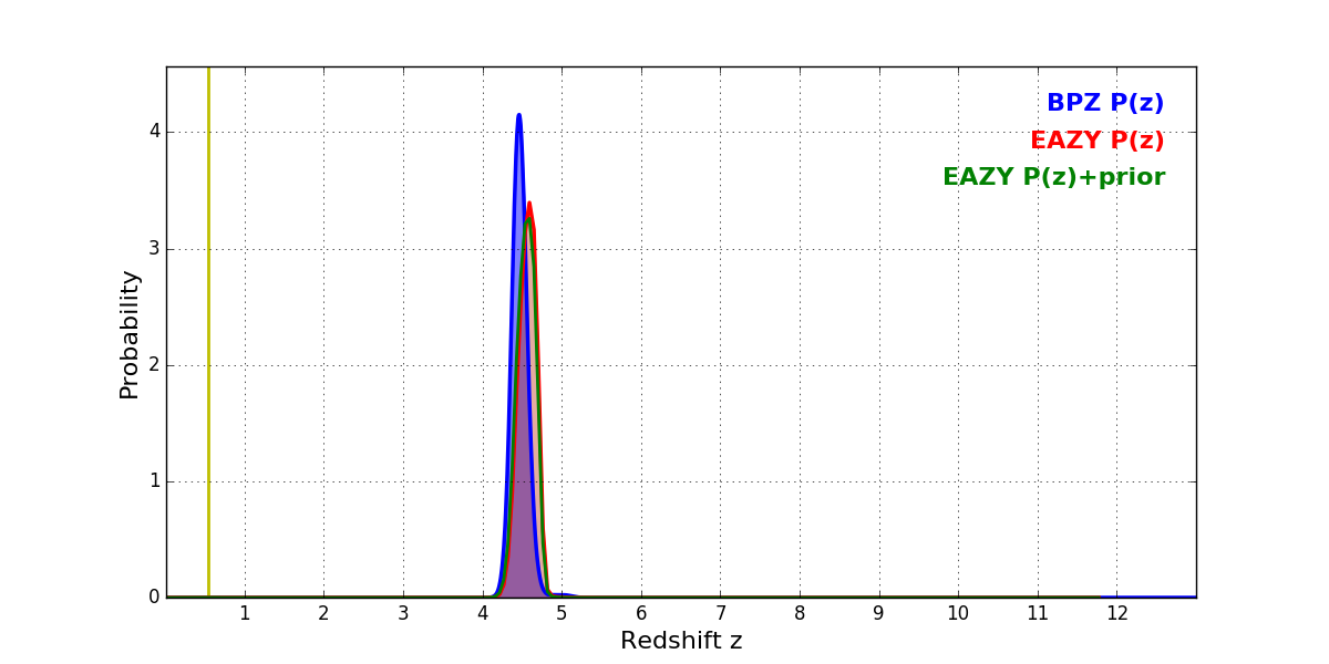 In P(z) plots: Yellow lines mark the cluster redshift z = 0.546,