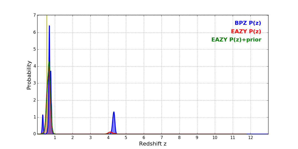 In P(z) plots: Yellow lines mark the cluster redshift z = 0.546,