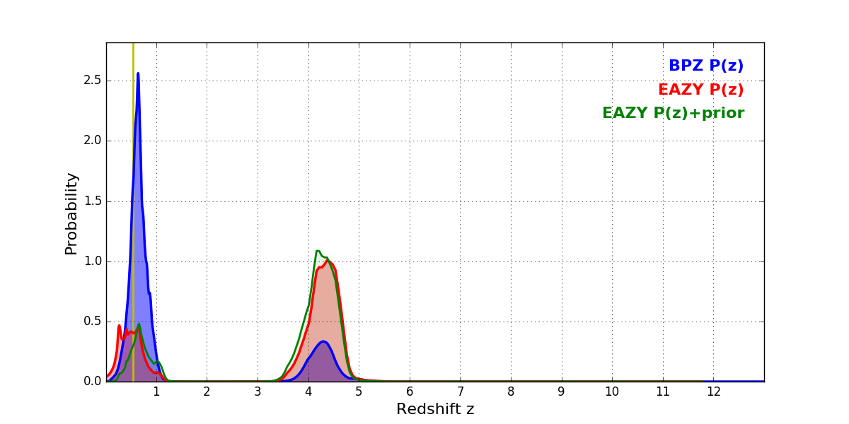 In P(z) plots: Yellow lines mark the cluster redshift z = 0.546,