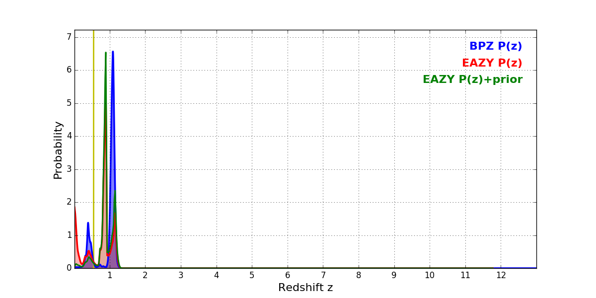 In P(z) plots: Yellow lines mark the cluster redshift z = 0.546,