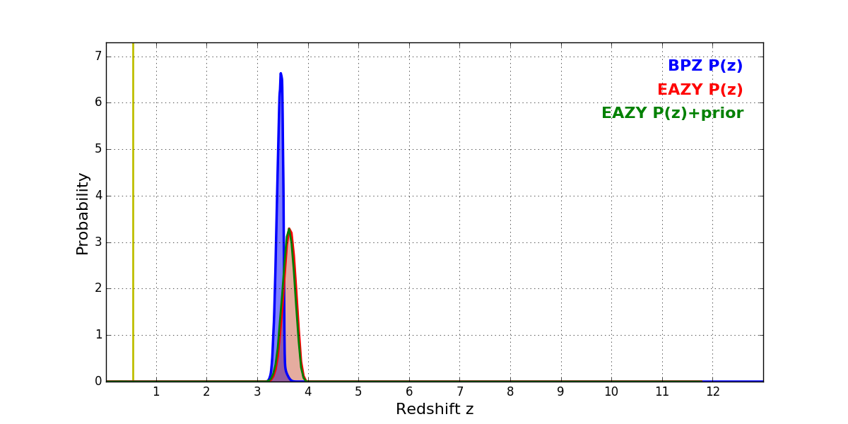 In P(z) plots: Yellow lines mark the cluster redshift z = 0.546,
