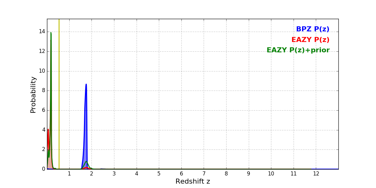 In P(z) plots: Yellow lines mark the cluster redshift z = 0.546,