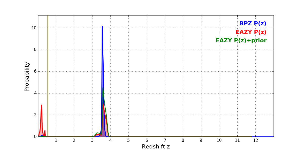 In P(z) plots: Yellow lines mark the cluster redshift z = 0.546,
