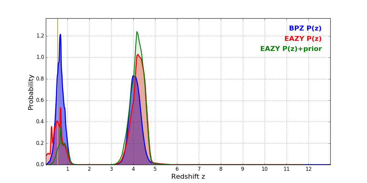 In P(z) plots: Yellow lines mark the cluster redshift z = 0.546,