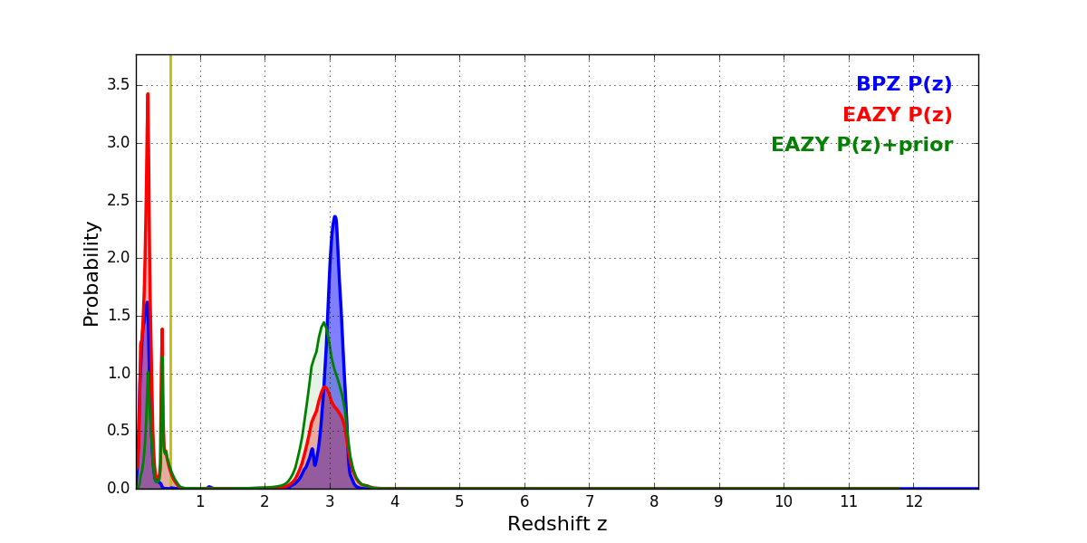 In P(z) plots: Yellow lines mark the cluster redshift z = 0.546,