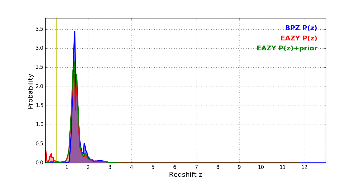 In P(z) plots: Yellow lines mark the cluster redshift z = 0.546,
