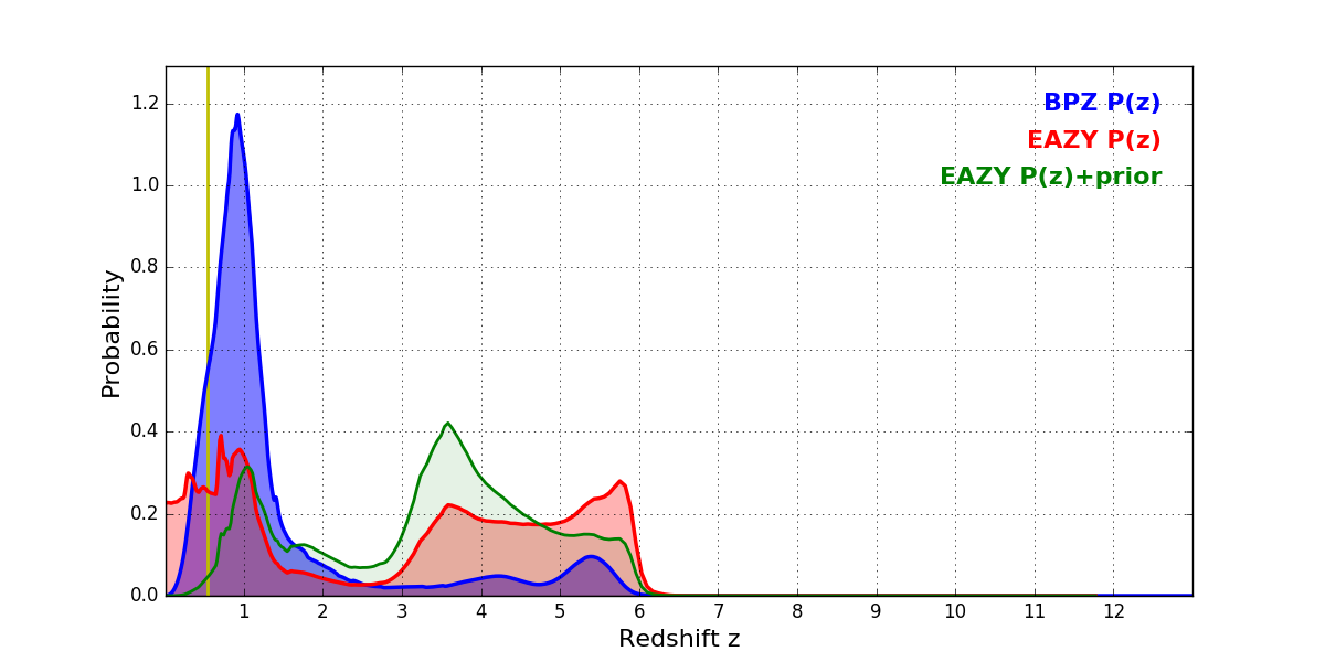 In P(z) plots: Yellow lines mark the cluster redshift z = 0.546,