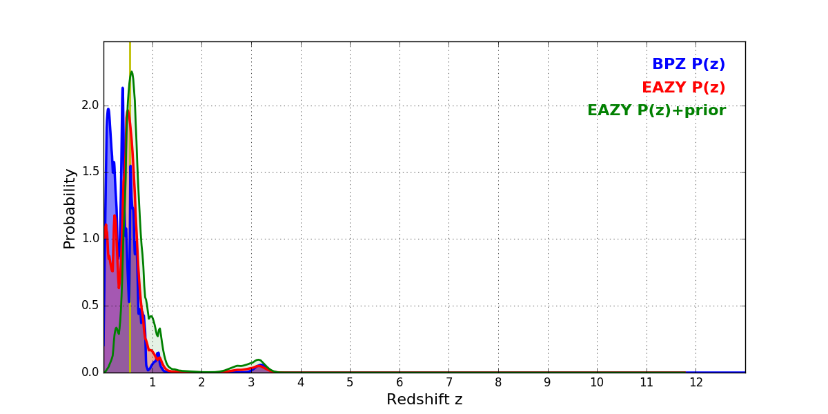 In P(z) plots: Yellow lines mark the cluster redshift z = 0.546,