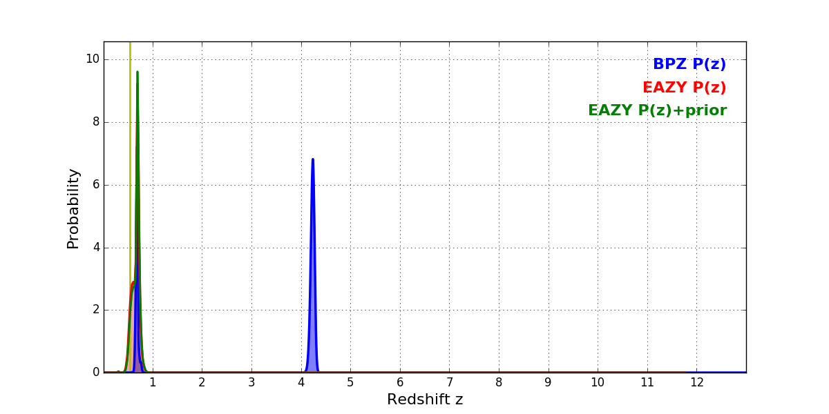 In P(z) plots: Yellow lines mark the cluster redshift z = 0.546,