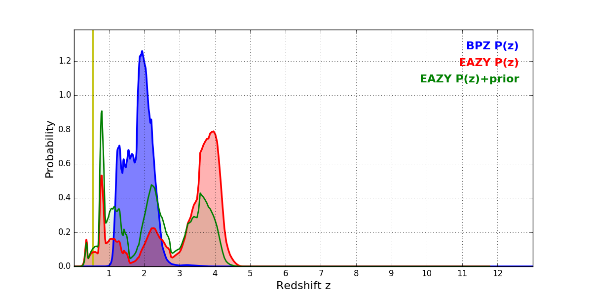 In P(z) plots: Yellow lines mark the cluster redshift z = 0.546,