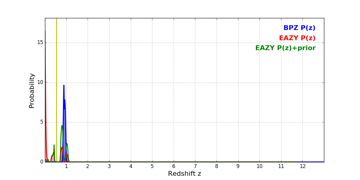 In P(z) plots: Yellow lines mark the cluster redshift z = 0.546,