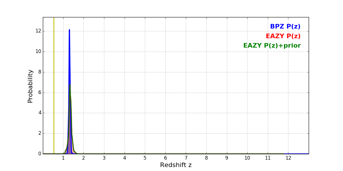 In P(z) plots: Yellow lines mark the cluster redshift z = 0.546,