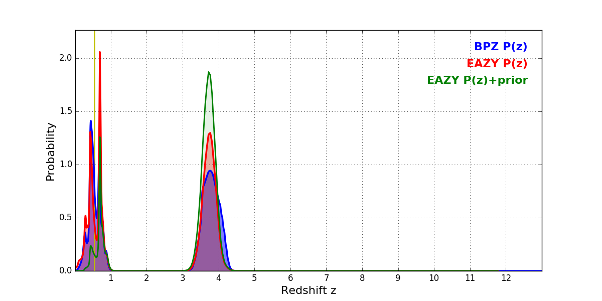 In P(z) plots: Yellow lines mark the cluster redshift z = 0.546,