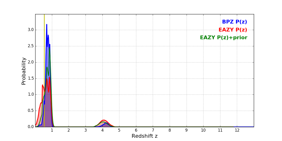 In P(z) plots: Yellow lines mark the cluster redshift z = 0.546,