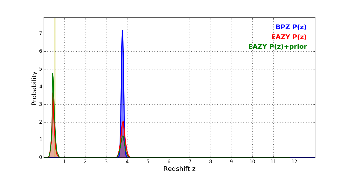 In P(z) plots: Yellow lines mark the cluster redshift z = 0.546,