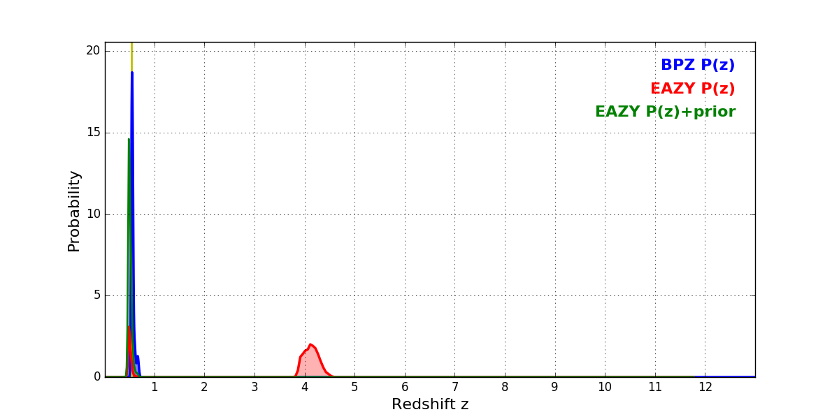 In P(z) plots: Yellow lines mark the cluster redshift z = 0.546,