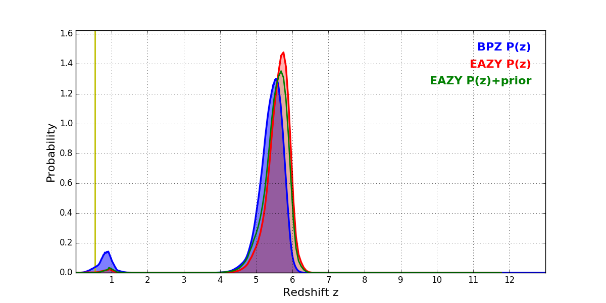 In P(z) plots: Yellow lines mark the cluster redshift z = 0.546,