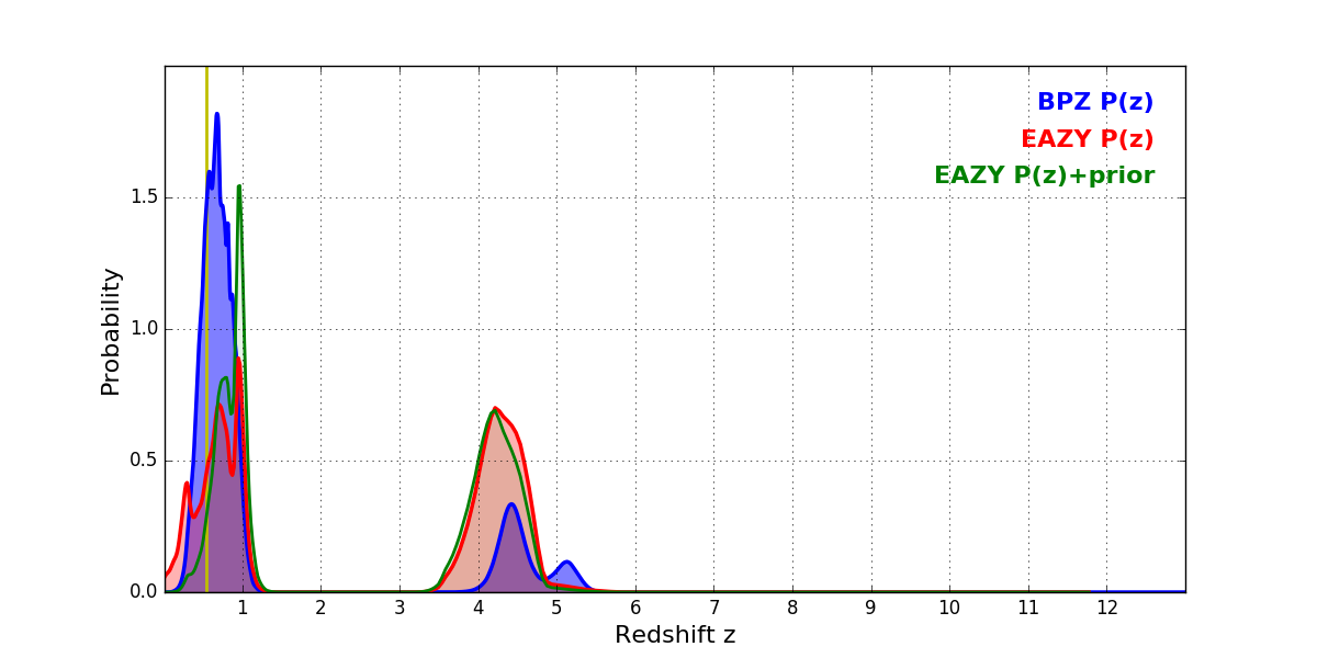In P(z) plots: Yellow lines mark the cluster redshift z = 0.546,